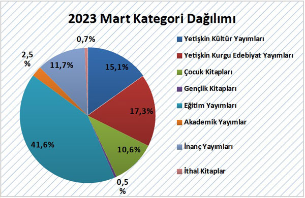 2023 yılından itibaren kategori başlıkları THGM sisteminde yenilenmiştir. Bizde bu yıldan itibaren raporlamalarımızı yeni başlıkları dikkate alarak yapıyor olacağız. 2023 yılı Mart ayında yayıncılarımızın almış olduğu bandrollerin kategori dağılımına göre yayımlanan kitapların %15,1’ini Yetişkin Kültür Yayımları, %17,3’ünü Yetişkin Kurgu Edebiyat Yayımları, %10,6'sını Çocuk Kitapları, %0,5'ini Gençlik Kitapları, %11,7'sini İnanç Yayımları, %2,5'ini Akademik Yayımlar, %0,7’sini İthal kitaplar ve %41,6'sını Eğitim Yayımları oluşturdu.