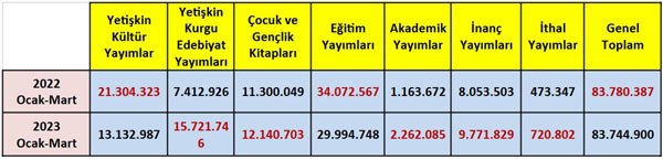 YAYFED verilerine göre; 2023 yılının ilk çeyreği ile bir önceki yılın aynı çeyreği ile karşılaştırıldığında kitap üretimi yaklaşık aynı seviyelerde gerçekleşti.Yılın ilk çeyreği dikkate alındığında 2022 yılında gerçekleşen kitap üretim adedi 83.780.387 iken 2023 yılındaki üretim 83.744.900 adettir. Bu rakamlara bakarak son iki yılın ilk çeyreğindeki kitap üretimi yaklaşık aynı adette gerçekleşmiş olduğunu söyleyebiliriz.