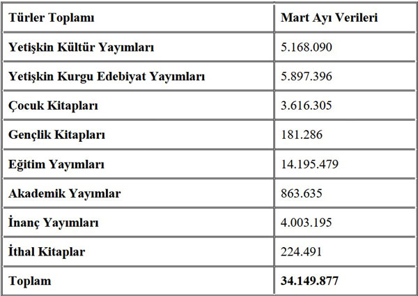 Kurucu üyesi olduğumuz Yayımcı Meslek Birlikleri Federasyonu (YAYFED) verilerine göre; 2023 yılının Mart ayında yayıncılarımız 34.149.877 adet kitap üretimi gerçekleştirdi.