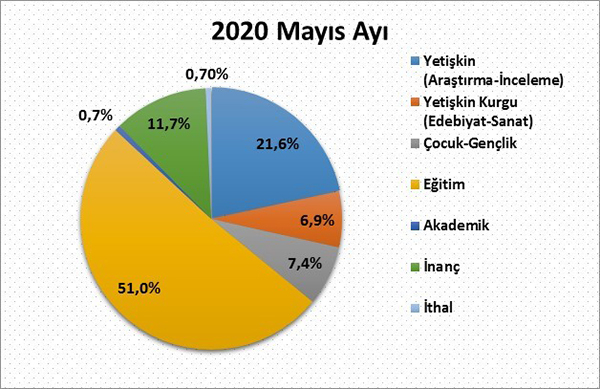 2020 yılı Mayıs ayında alınan bandrollerin kategori dağılımına göre yayımlanan kitapların %21,6’sını yetişkin inceleme araştırma kitapları, yaklaşık %6,9’unu yetişkin edebiyat sanat kitapları, yaklaşık %7,4'ünü çocuk ve gençlik kitapları, %11,7'sini inanç kitapları, %0,7'sini akademik yayınlar, yaklaşık %51'ini eğitim alanındaki kitaplar ve %0,7’sini ithal kitaplar oluşturdu.