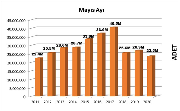 Kurucu üyesi olduğumuz Yayımcı Meslek Birlikleri Federasyonu (YAYFED) verilerine göre; 2020 Mayıs ayında 23.588.060 adet kitap yayımlanmıştır. 2019 yılının aynı ayında yayımlanan kitap sayısı 26.957.340 adet olarak kayıtlara geçmişti. Söz konusu veriler kıyaslandığında 2020 Mayıs ayında bir önceki yılın mayıs ayına göre bu yıl yaklaşık %12 oranında küçülme gerçekleştiği ortaya çıkmaktadır.
