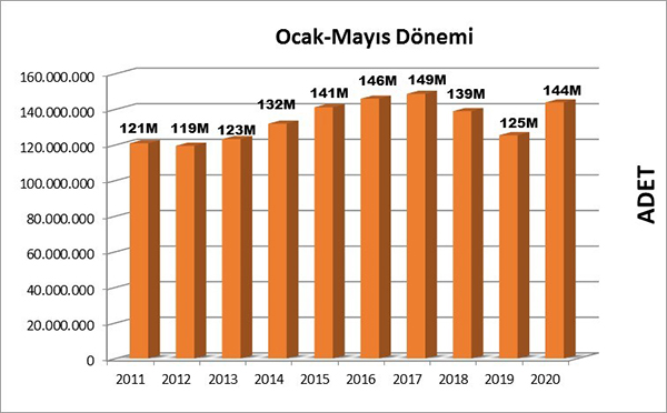 Mayıs ayı ile yılın ilk beş ayı tamamlandı. Beş ayda yayımlanan kitap sayısı 2019 yılında 125.438.567 adet iken 2020 yılında %15 artarak 143.844.367 adet oldu.
