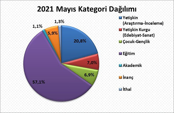 2021 yılı Mayıs ayında yayıncılarımızın almış olduğu bandrollerin kategori dağılımına göre yayımlanan kitapların %20,8’sini yetişkin inceleme araştırma kitapları, yaklaşık %7’sini yetişkin edebiyat sanat kitapları, yaklaşık %6,9'unu çocuk ve gençlik kitapları, %5,9'unu inanç kitapları, %1,1'ini akademik yayınlar, %57,1'ini eğitim alanındaki kitaplar ve yaklaşık %1,3’ünü ithal kitaplar oluşturdu.