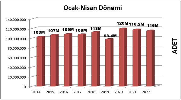 2021 yılının ilk dört ayında yayımlanan toplam kitap sayısı 118.243.011 adet olarak gerçekleşmişti. Bu yılın ilk dört ayında ise yayımlanan kitap sayısı 116.030.924 adettir. Bu da yılın ilk dört ayında geçtiğimiz yıla göre %1,8 oranında bir küçülme olduğunu göstermektedir.