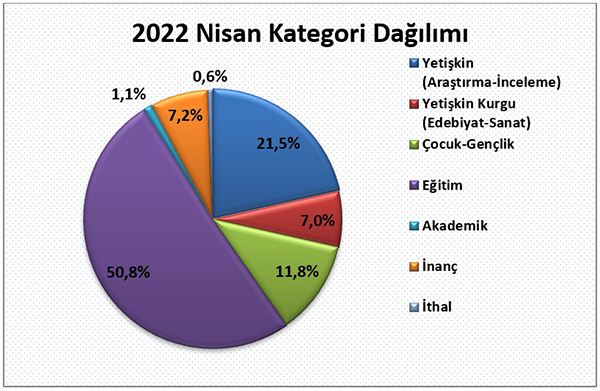 2022 yılı Nisan ayında yayıncılarımızın almış olduğu bandrollerin kategori dağılımına göre; yayımlanan kitapların %21,5’ini yetişkin inceleme araştırma kitapları, %7’sini yetişkin edebiyat sanat kitapları, %11,8'ini çocuk ve gençlik kitapları, %7,2'sini inanç kitapları, %1,1'ini akademik yayınlar, %50,8'ini eğitim alanındaki kitaplar ve %0,6’sını ithal kitaplar oluşturdu.