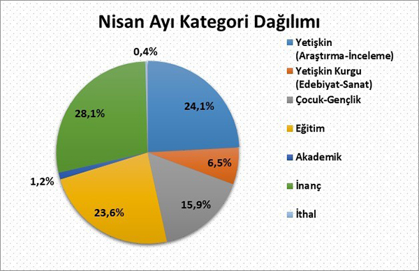 2018 yılı Nisan ayında yayıncılarımızın almış olduğu bandrollerin, kategori dağılımına göre yayımlanan kitapların %24,1'ini yetişkin inceleme araştırma kitapları, %6,5'ini yetişkin edebiyat sanat kitapları, yaklaşık %16'sını çocuk ve gençlik kitapları, %28,1'ini inanç kitapları, %1,2'sini akademik yayınlar, yaklaşık %24'ünü eğitim alanındaki kitaplar ve %0,4’ünü ithal kitaplar oluşturdu.
