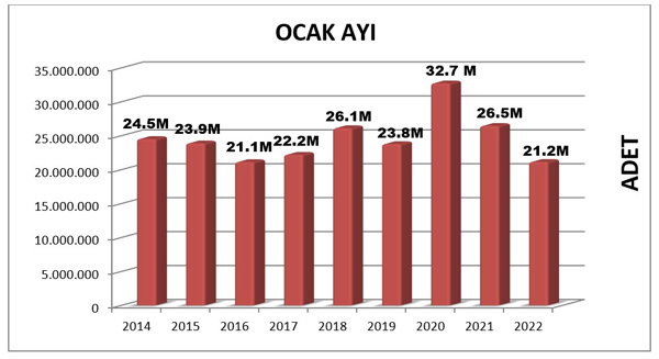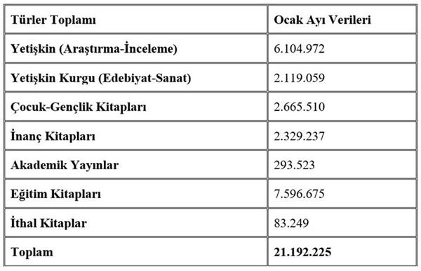 2021 yılının aynı ayındaki bu rakam 26.490.859 olarak kayıtlara geçmişti. Geçen yıla oranla %20 oranında bir düşüş görülmektedir. Son iki yıldır yılın ilk ayında bir önceki yılın aynı ayına göre kitap üretiminde ciddi düşüş yaşanmıştır. Mevcut koşullar altında önümüzdeki aylarda bu düşüşün telafi edilebilmesi zor gözükmektedir.