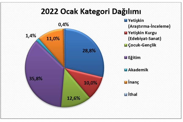 2022 yılı Ocak ayında yayıncılarımızın almış olduğu bandrollerin kategori dağılımı şöyledir; yayımlanan kitapların %28,8’ini yetişkin inceleme-araştırma kitapları, %10’unu yetişkin kurgu edebiyat-sanat kitapları, %12,6’sını çocuk-gençlik kitapları, %11’ini inanç kitapları, %1,4’ünü akademik yayınlar, %35,8’ini eğitim alanındaki kitaplar ve yaklaşık %0,4’ünü de ithal kitaplar oluşturdu.