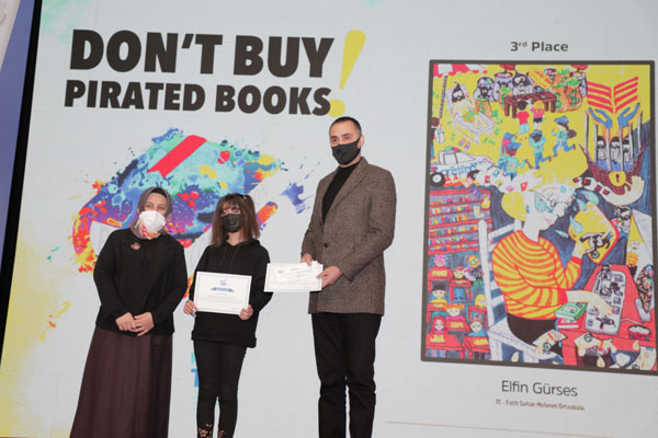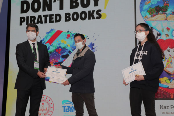 “Korsan Kitaba Hayır Resim Yarışması”nda hem eser sahibine hem de okul idaresine ikincilik ödülünü Türkiye Basım Yayın Meslek Birliği Başkanı Mustafa Doğru takdim etti. Pendik Özel Balkanlar Koleji Ortaokulu öğrencisi Naz Peri İrem Kurt’a ikincilik ödülü olarak yarım altın ve okul kütüphaneleri için de 3.000 TL’lik kitap çeki verildi.