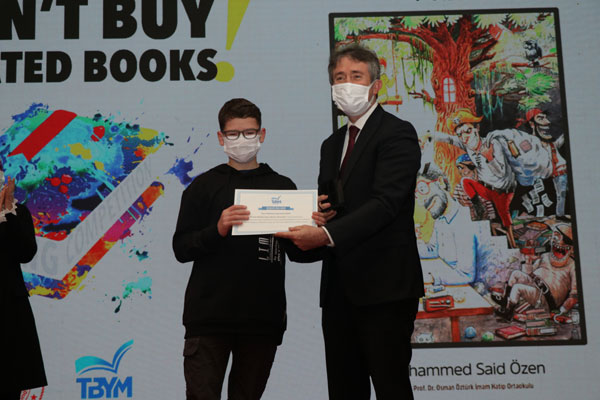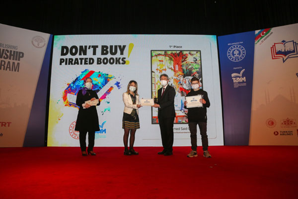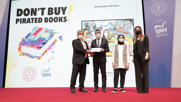 “Korsan Kitaba Hayır Resim Yarışması”nda hem eser sahibine hem de okul idaresine mansiyon ödülünü TBYM Korsanla Mücadele Komisyonu Başkanı Adem Koşkulu takdim etti. Ümraniye Fatih İmam Hatip Ortaokulu öğrencisi Berra Karadumanoğlu’na mansiyon ödülü olarak gram altın ve okul kütüphaneleri için de 1.500 TL’lik kitap çeki verildi.