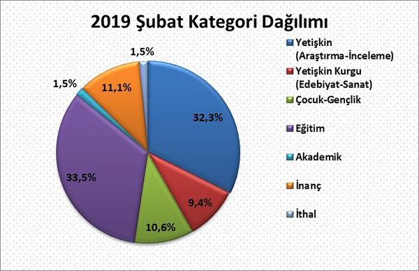 2019 yılı Şubat ayında yayıncılarımızın almış olduğu bandrollerin kategori dağılımına göre yayımlanan kitapların %32,3'ünü yetişkin inceleme, araştırma kitapları, %9,4’ünü yetişkin edebiyat sanat kitapları, %10,6'sını çocuk ve gençlik kitapları, %11,1'ini inanç kitapları, %1,5'ini akademik yayınlar, %33,5'ini eğitim alanındaki kitaplar ve %1,5’ini ithal kitaplar oluştururken Şubat ayında yayıncılar tarafından yapılan bandrol talebi 23.628.654 adet olarak açıklandı.