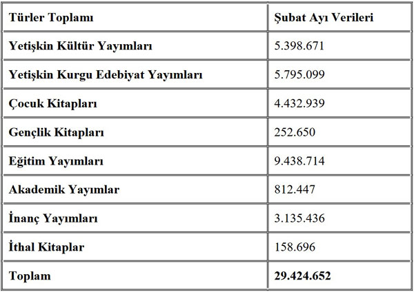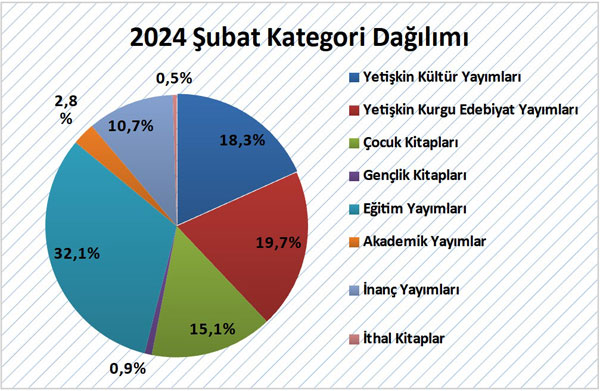 2024 yılı Şubat ayında yayıncılarımızın almış olduğu bandrollerin, kategori dağılımına göre yayımlanan kitapların %18,3’ünü Yetişkin Kültür Yayımları, %19,7’sini Yetişkin Kurgu Edebiyat Yayımları, %15,1'ini Çocuk Kitapları, %0,9'unu Gençlik Kitapları, %10,7'sini İnanç Yayımları, %2,8'ini Akademik Yayımlar, %0,5’ini İthal kitaplar ve %32,1'ini Eğitim Yayımları oluşturdu.