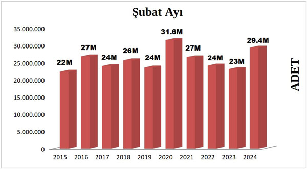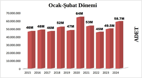 Yılın ilk iki ayı dikkate alındığında 2023 yılında gerçekleşen kitap üretim adedi 49.595.023 iken, 2024 yılındaki üretim 58.755.038 adettir. Son iki yılın ilk iki ayındaki toplam kitap üretimi karşılaştırıldığında, 2024 yılında bir önceki yıla göre %18,5 oranında büyüme gerçekleşmiştir.