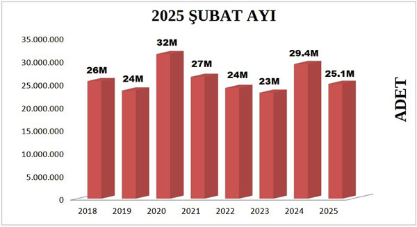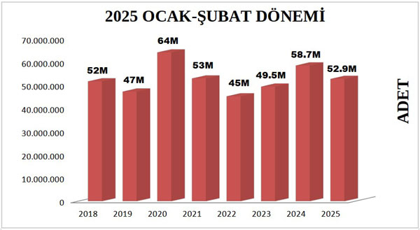 Yılın ilk iki ayı dikkate alındığında, 2024 yılında gerçekleşen kitap üretim adedi 58.755.038 iken, 2025 yılındaki üretimi 52.928.175 adettir. Son iki yılın ilk iki ayındaki toplam kitap üretimi karşılaştırıldığında, 2025 yılında bir önceki yıla göre %10 oranında küçülme gerçekleşmiştir.