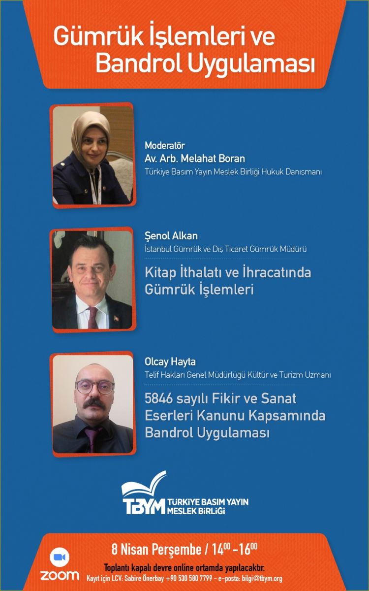 Aynı zamanda ithal kitaplarda bandrol uygulamasının yaygınlaştırılması ve telif haklarının güçlendirilmesi ve geliştirilmesine yönelik bilgilerin de aktarıldığı programda Kültür ve Turizm Uzmanı Olcay Hayta “5846 Sayılı Fikir ve Sanat Eserleri Kanunu Kapsamında Bandrol Uygulaması” ve Gümrük Müdürü Şenol Alkan da “Kitap İthalatı Ve İhracatında Gümrük İşlemleri” başlıklı sunumları ile aydınlatıcı bilgiler verdiler.