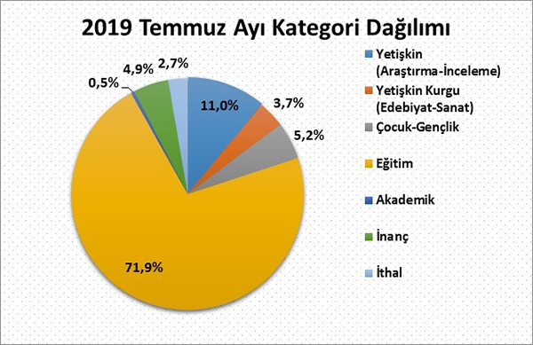 2019 yılı Temmuz ayında yayıncılarımızın almış olduğu bandrollerin kategori dağılımına göre yayınlanan kitapların %11'ini yetişkin inceleme, araştırma kitapları, %3,7’sini yetişkin edebiyat sanat kitapları, yaklaşık %5,2'sini çocuk ve gençlik kitapları, %4,9'unu inanç kitapları, %0,5'ini akademik yayınlar, %71,9'unu eğitim alanındaki kitaplar ve yaklaşık %2,7’sini ithal kitaplar oluşturdu.