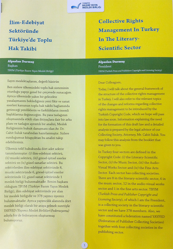 Başkan Alpaslan Durmuş, çalıştayda “İlim-Edebiyat Sektöründe Türkiye’de Toplu Hak Takibi” konulu bir sunum yapmıştır. Ayrıca yine çalıştayda “Yeni Telif Yasasını Beklerken” adlı eseri ve bilgilendirme raporunu katılımcılara takdim etmiştir.